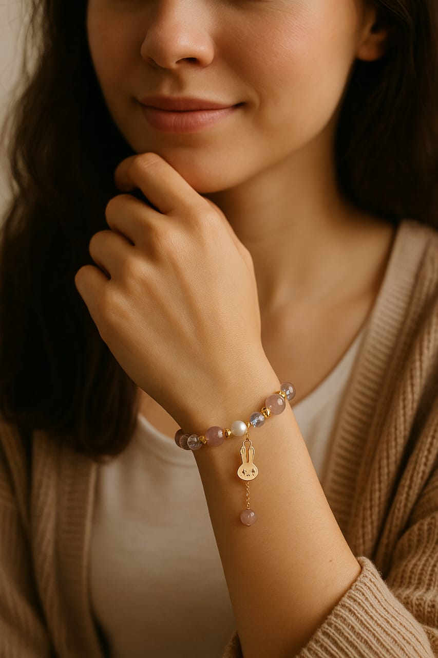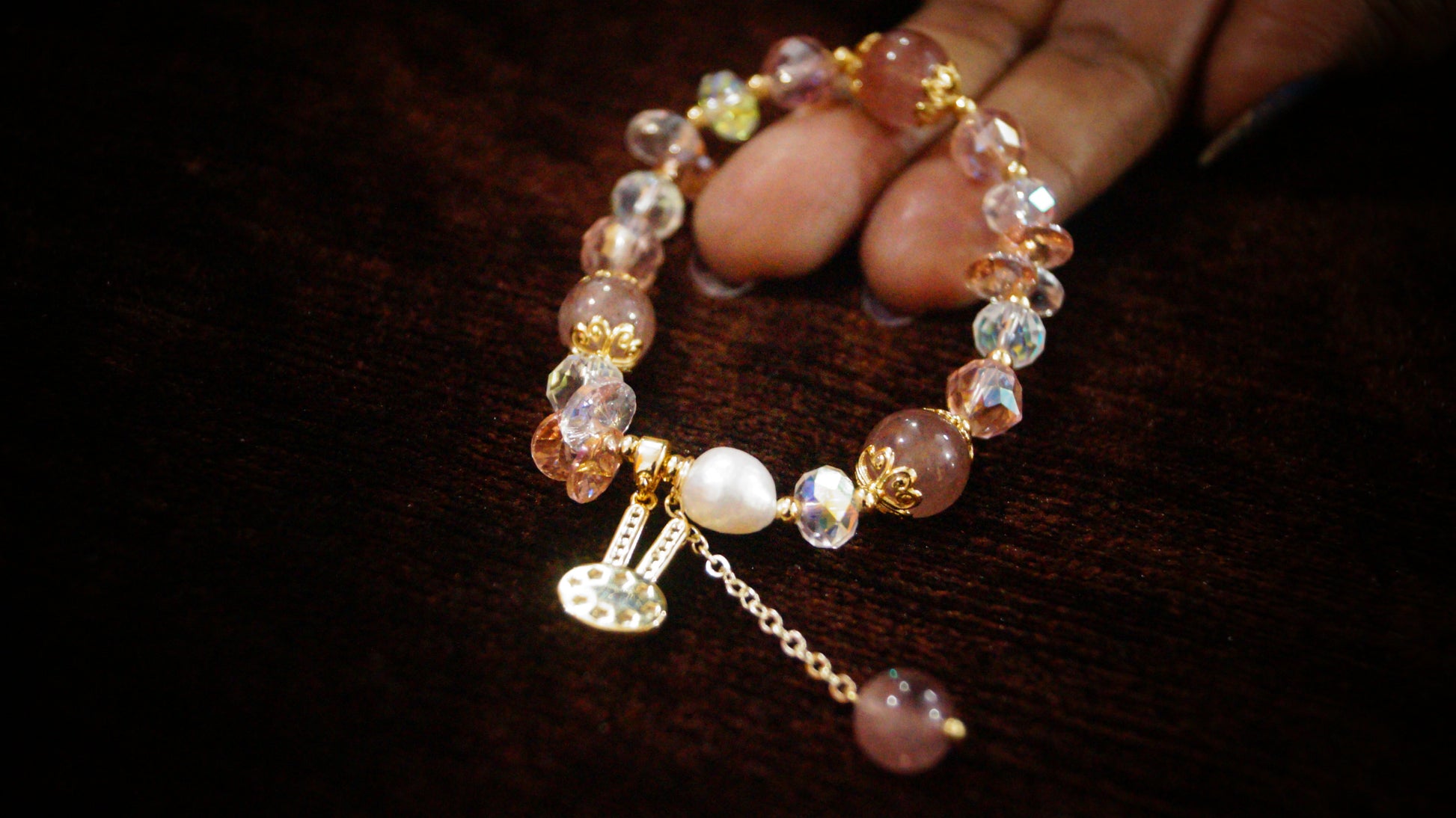 A shimmering blend of crystal-clear beads, soft blush stones, and gold accents — finished with a playful charm that catches the light and every eye. "Urban Halo" is your perfect touch of sparkle for both everyday glam and special nights out.